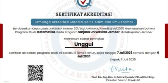 Pada 18 Desember 2025, FMIPA Universitas Jember (UNEJ) menggelar Yudisium Pascasarjana (S2) ke-82 dan Sarjana ke-115 untuk periode 6 Tahun Akademik 2025/2026. Acara yang berlangsung di Auditorium Jurusan Fisika ini dihadiri oleh anggota senat FMIPA serta perwakilan tenaga pendidik dan kependidikan. Prof. Drs. Dafik, M.Sc., Ph.D., Dekan FMIPA UNEJ, dalam pidato yudisium menyampaikan bahwa kelulusan ini mencerminkan tagline FMIPA UNEJ, yaitu “Tiga Koma Lima Pangkat Empat”, yang menggarisbawahi pencapaian penting: 3,5 tahun untuk ujian skripsi, IPK 3,5 untuk bersaing di dunia kerja, dan 3,5 bulan untuk mendapatkan pekerjaan setelah lulus, dengan gaji pertama sekitar 3,5 juta. Prof. Dafik juga menekankan pentingnya long life education dan kesadaran diri dalam mengembangkan potensi untuk berprestasi di dunia kerja. Continue reading