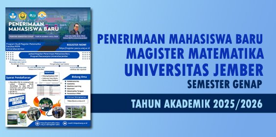 Berdasarkan Keputusan Rektor Universitas Jember nomor 7928/UN25/KP.10.01/2025, yang diterbitkan pada tanggal 24 November 2025, Jurusan Matematika Fakultas Matematika dan Ilmu Pengetahuan Alam Universitas Jember dengan bangga mengumumkan terpilihnya Dr. Kiswara Agung Santoso, S.Si., M.Kom. sebagai Ketua Jurusan Matematika untuk periode 2025-2029. Dalam kepemimpinan ini, Kusbudiono, S.Si., M.Si. akan menjabat sebagai Sekretaris Jurusan Matematika yang juga akan mengabdi untuk periode yang sama.
