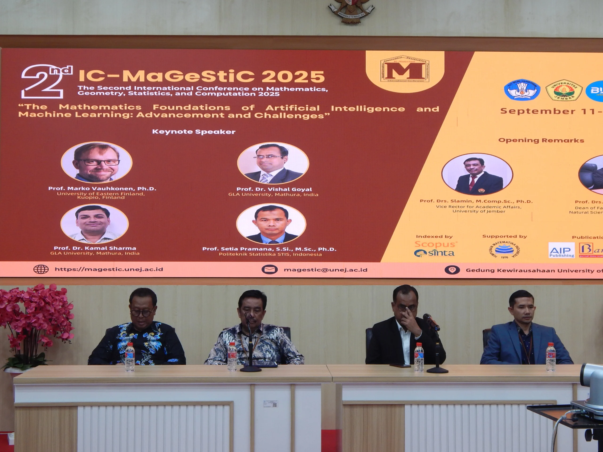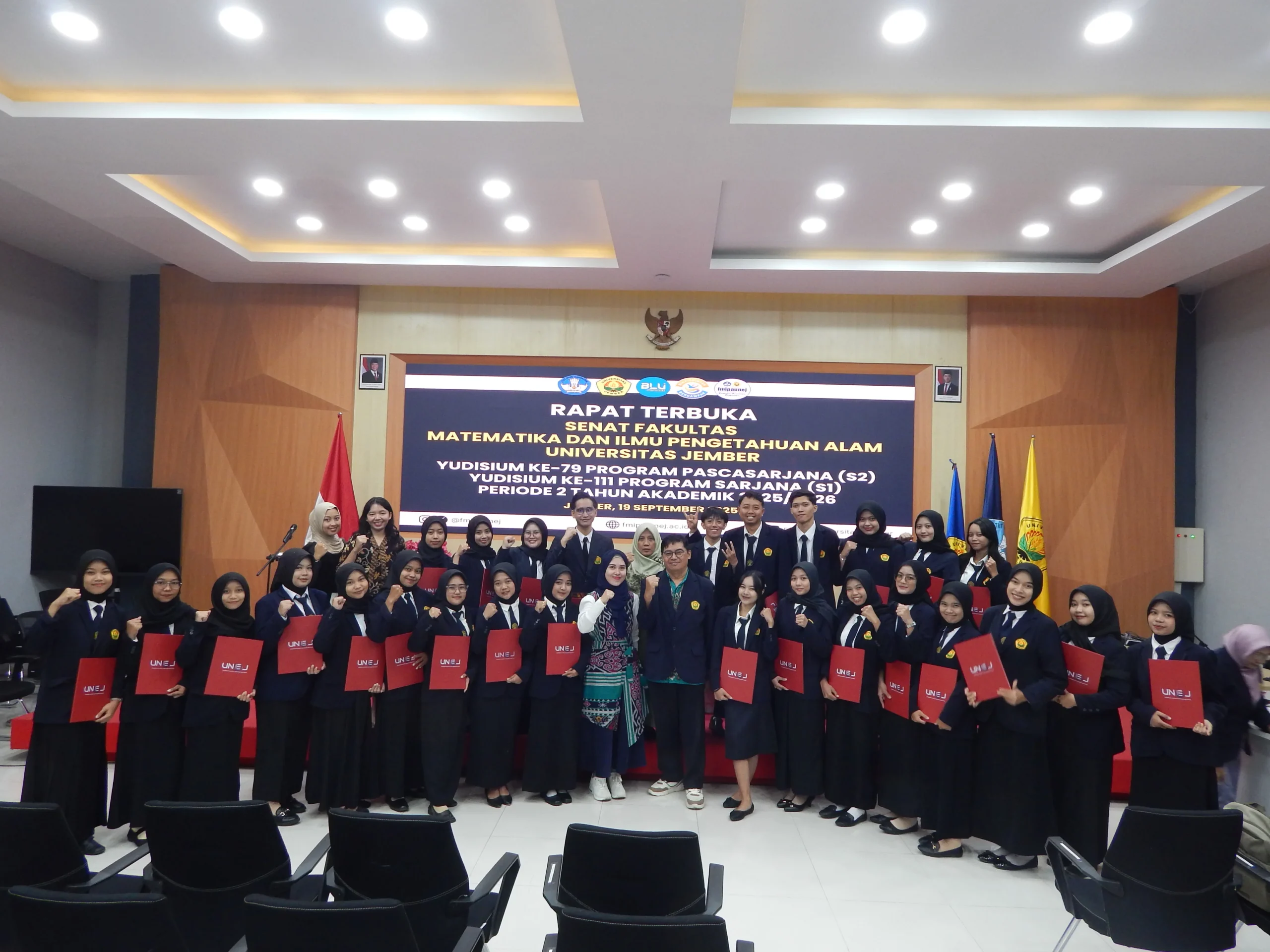 Jurusan Matematika FMIPA Universitas Jember turut berbangga atas kesuksesan 25 mahasiswa S1 dan 2 mahasiswa S2 FMIPA UNEJ yang telah lulus dan mengikuti Yudisium Pascasarjana (S2) ke-79 dan Sarjana ke-111 Fakultas MIPA Universitas Jember periode II Tahun Akademik 2025/2026. Acara yudisium ini berlangsung pada hari Jum’at, 19 September 2025 di Auditorium Gedung Kewirausahaan Universitas Jember dan dihadiri oleh para pejabat universitas, dosen, dan undangan lainnya. Pada acara yudisium ini, juga disampaikan penghargaan kepada para yudisi yang berprestasi, termasuk beberapa lulusan jurusan matematika yang lulus dengan pujian sebanyak 17 mahasiswa S1 dan 2 mahasiswa S2, sekaligus menjadi lulusan terbaik dal periode ini untuk mahasiswa S2 Matematika yaitu Muhammad Ikrom, S.Si. dengan IPK 3,89 dan masa studi dalam 1 tahun 5 bulan 3 hari. Penghargaan ini merupakan bukti bahwa para lulusan matematika FMIPA UNEJ memiliki kemampuan dan dedikasi yang tinggi dalam mencapai tujuan akademik.