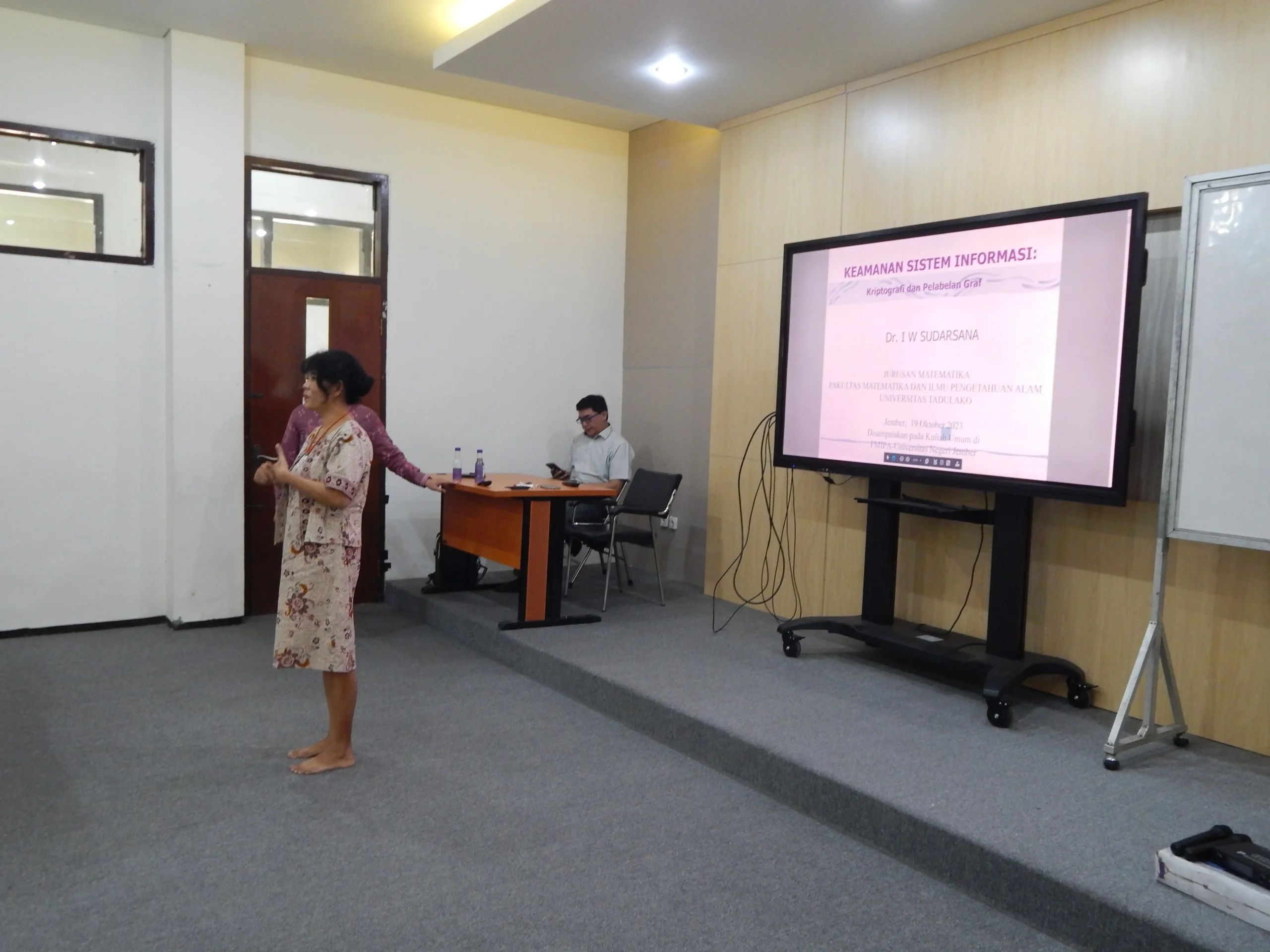 Kelompok Riset Graph dan Algebra (GA) Jurusan Matematika FMIPA UNEJ selenggarakan kuliah umum dengan narasumber Prof. Dr. I Wayan Sudarsana dari Universitas Tadulako (19/10). Mengangkat tema Keamanan Sistem Informasi: Kriptografi dan Pelabelan Graf, Prof. Wayan mengawali kuliah umum dengan menceritakan keamanan yang sering ditemui di kehidupan sehari-hari. “Anda semua pasti sering bertransaksi di bank, dan itu dibutuhkan keamanan suatu informasi khusus seperti pin atau token, proses keamanan itu biasa dikenal sebagai enkripsi yang terdapat kriptografi didalamnya,” awal Prof. Wayan.