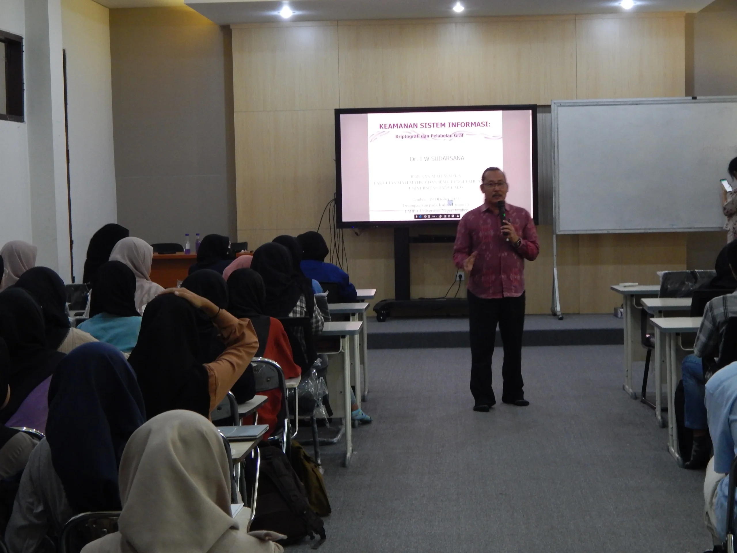 Gagasan faktosisasi bilangan prima diungkapkan oleh Ron Rivest, Aldi Shamir dan Len Adleman dari MIT yang populer dengan sebutan teknik RSA. “Jika 2 bilangan prima dikalikan maka akan mudah dihitung, tapi jika bilangan komposit yang merupakan hasil kali sejumlah bilangan prima maka sulit memfaktorkannya apalagi bilangan itu besar,” lanjutnya. Diujung acara Prof. Wayan mengatakan bahwa tren teknik penyandian saat ini adalah menggunakan pelabelan graf. Dan dari bahasan kuliah hari ini, beliau mengajak mahasiswa implementasikan pengamanan informasi berbasis jaringan pada proyek tugas akhir.