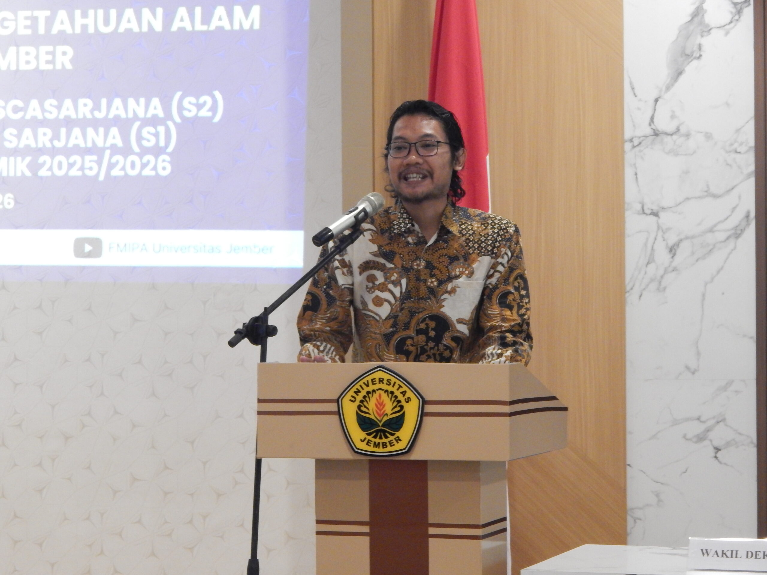 Dalam pidatonya, Dekan FMIPA Universitas Jember, Prof. Drs. Dafik, M.Sc., Ph.D., menyampaikan ucapan selamat dan sukses kepada seluruh peserta yudisium yang telah menyelesaikan studinya di FMIPA. Beliau menegaskan bahwa ilmu yang diperoleh selama masa perkuliahan hendaknya menjadi bekal yang bermanfaat untuk membangun keterampilan, kreativitas, dan kesiapan menghadapi tantangan masa depan. Dekan juga mengingatkan bahwa para lulusan FMIPA tidak hanya diharapkan menunggu peluang kerja, tetapi juga mampu menciptakan peluang secara mandiri dengan bekal keilmuan yang dimiliki.