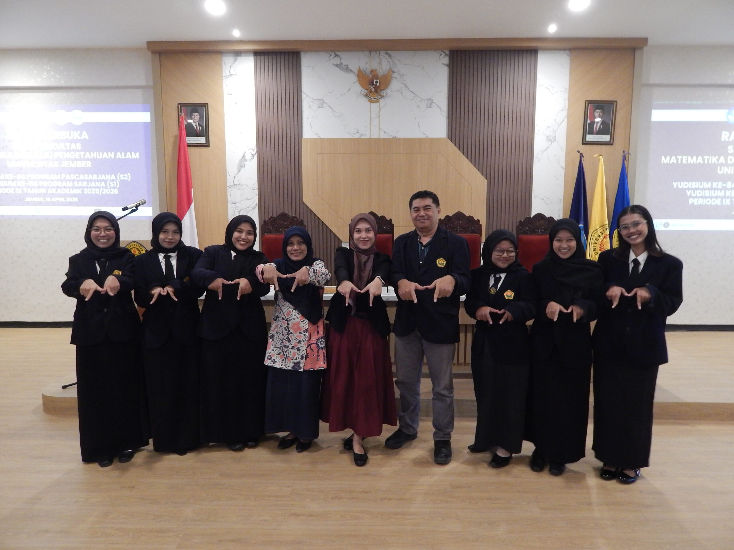 Pada rangkaian yudisium tersebut, pembacaan Surat Keputusan Dekan FMIPA Universitas Jember dilakukan oleh Wakil Dekan I FMIPA, Prof. Dra. Hari Sulistiyowati, M.Sc., Ph.D., yang kemudian dilanjutkan dengan pemberian ucapan selamat oleh jajaran pimpinan fakultas dan para ketua jurusan kepada seluruh lulusan. Di antara para yudisi, capaian Evita Figur Anggraheni sebagai peraih IPK tertinggi program magister menjadi salah satu sorotan utama yang membanggakan, khususnya bagi keluarga besar Jurusan Matematika.