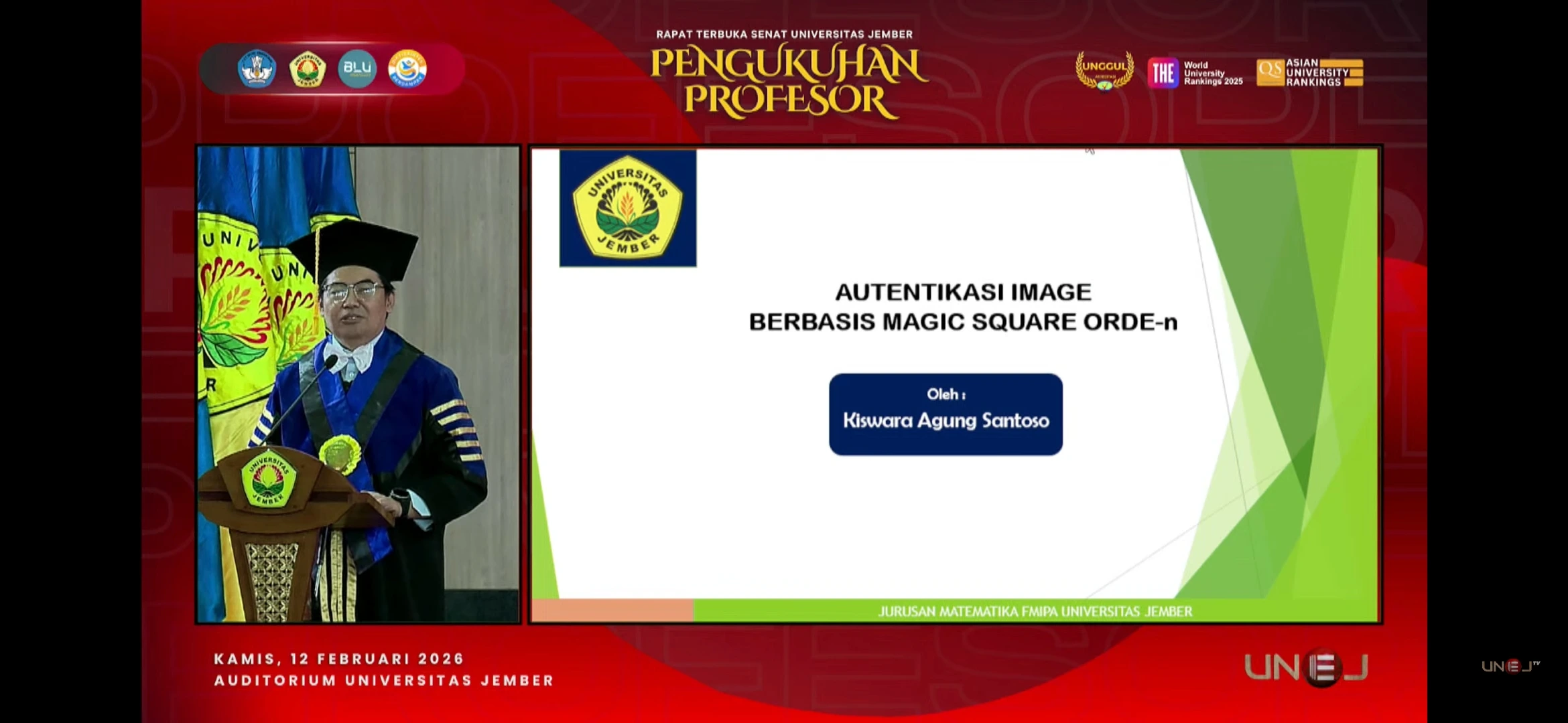 Jurusan Matematika FMIPA Universitas Jember menyampaikan apresiasi dan kebanggaan atas pengukuhan Prof. Dr. Kiswara Agung Santoso, S.Si., M.Kom. sebagai profesor yang dialksanakan pada hari Kamis tanggal 12 Februari 2026 di Auditorium Universitas Jember. Pengukuhan ini menjadi momentum penting bagi penguatan ekosistem akademik di FMIPA Universitas Jember khususnua jurusan Matematika, sekaligus menegaskan konsistensi pengembangan keilmuan yang relevan dengan kebutuhan zaman, khususnya pada bidang matematika, komputasi, dan keamanan informasi.